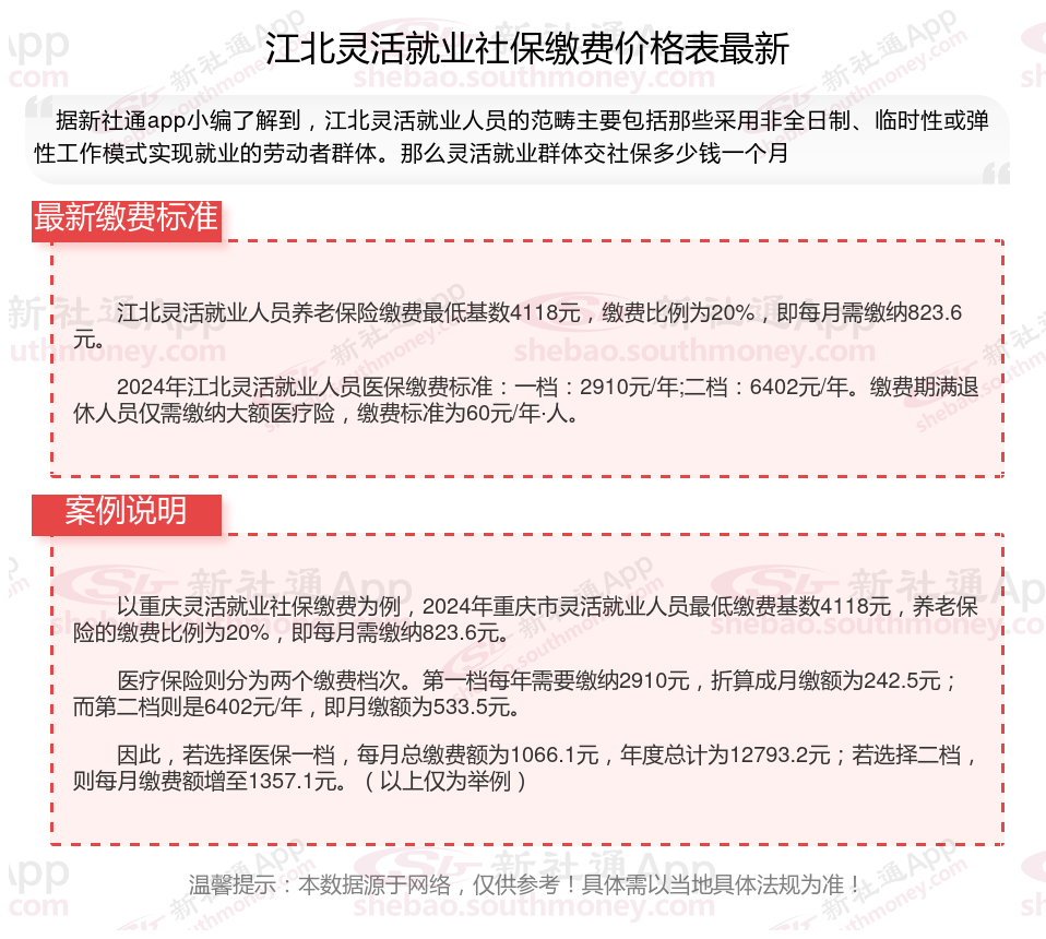 以上就是带来江北灵活就业社保缴费标准相关知识,内容及数据仅供参考,希望对你有帮助,欢迎关注/下载新社通app解锁更多社保专业资讯。