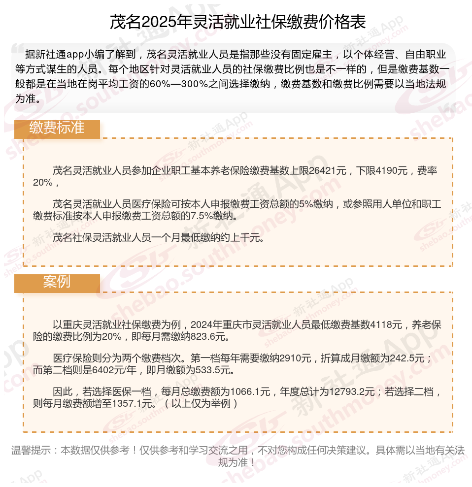 提示:茂名灵活就业人员每个月的缴费压力还是比较大的,每个月的社保费用都是千元,缴费档次越高,灵活就业人员要缴纳的费用也越多。
