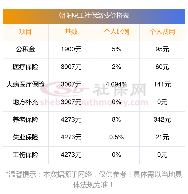 社保缴纳比例一览,社保公司和个人各交多少?下表是2023-2024年朝阳社保费用明细参考,新社通app-社保缴费查询工具提供的最新数据如下: