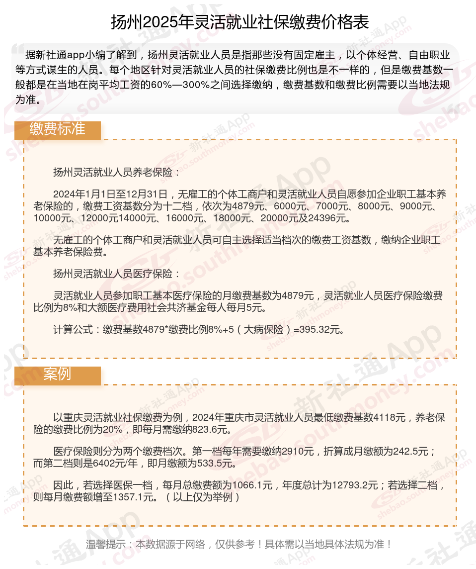 一、2025年扬州灵活就业社保缴费标准,灵活就业社保多少钱一个月?