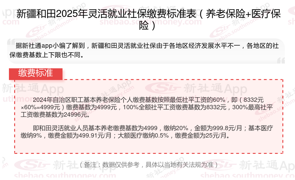 那么,自由职业者社保是多少钱一个月 新疆和田灵活社保交多少钱?根据新社通app-社保缴费查询工具提供的2025社保缴费标准详情数据: