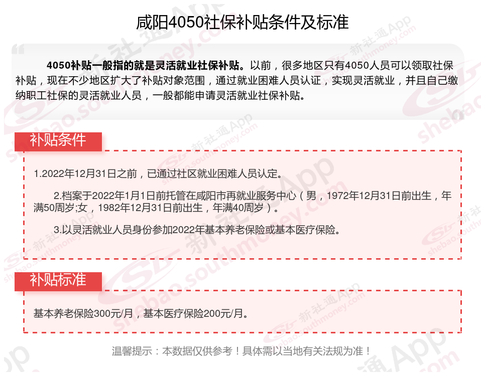 二、咸阳4050社保补贴标准及条件2025年最新消息