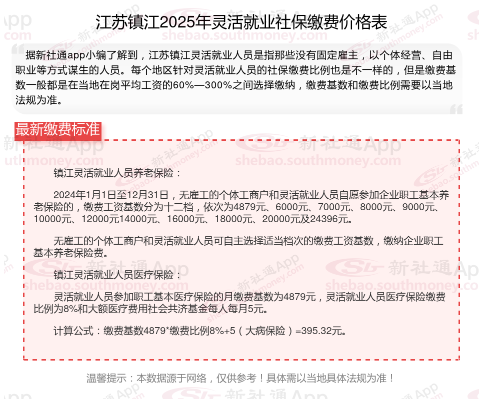 缴费标准最新公布!江苏镇江2024-2025年度灵活就业社保缴费基数明细来了,根据新社通app-社保缴费查询工具提供的2025社保缴费标准详情数据: