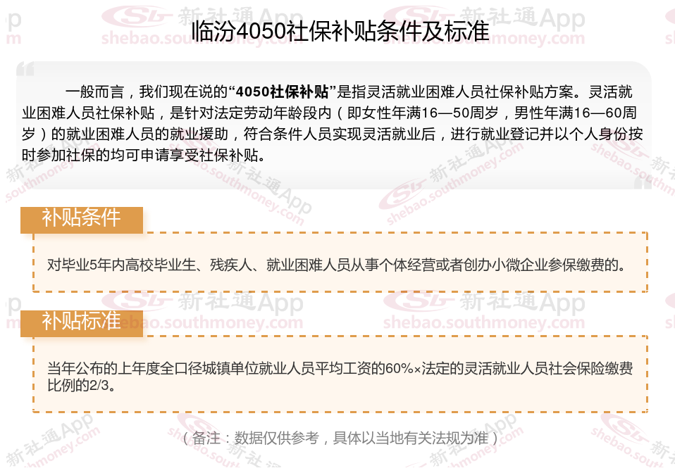 一、2025年临汾灵活就业4050社保补贴标准是多少?申请条件是什么?