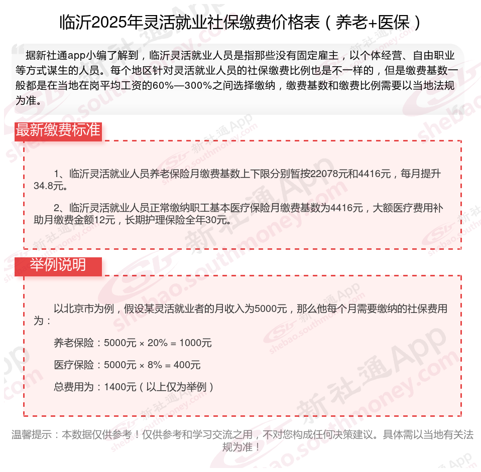 据新社通app数据显示,2024-2025年临沂灵活就业人员养老保险的缴费标准是根据缴费基数来确定的: