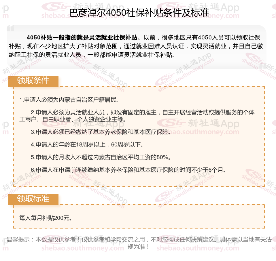 4050社保补贴标准据新社通app小编了解,通常,4050社保补贴包含基本医疗保险和基本养老保险两个险种,社保补贴金额为申请人实际缴纳基本养老保险和基本医疗保险金额的2/3,具体标准以当地社保局公布的数据为准!那么巴彦淖尔灵活就业人员4050补贴最新标准是多少,巴彦淖尔4050灵活就业人员社保补贴一年可以有多少钱?接下来随新社通APP小编具体了解一下4050社保补贴内容。