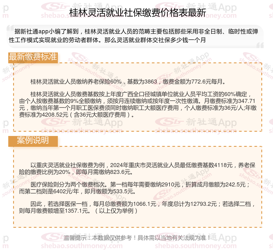 桂林灵活就业人员社保缴费基数2024-2025年最新标准是多少 灵活就业交社保划算吗?下表是2024-2025年桂林社保费用明细参考,根据新社通app-社保缴费查询工具提供的最新数据如下: