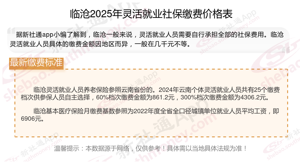 据新社通app数据显示,临沧灵活就业人员养老缴费基数2024-2025年最新标准如下: