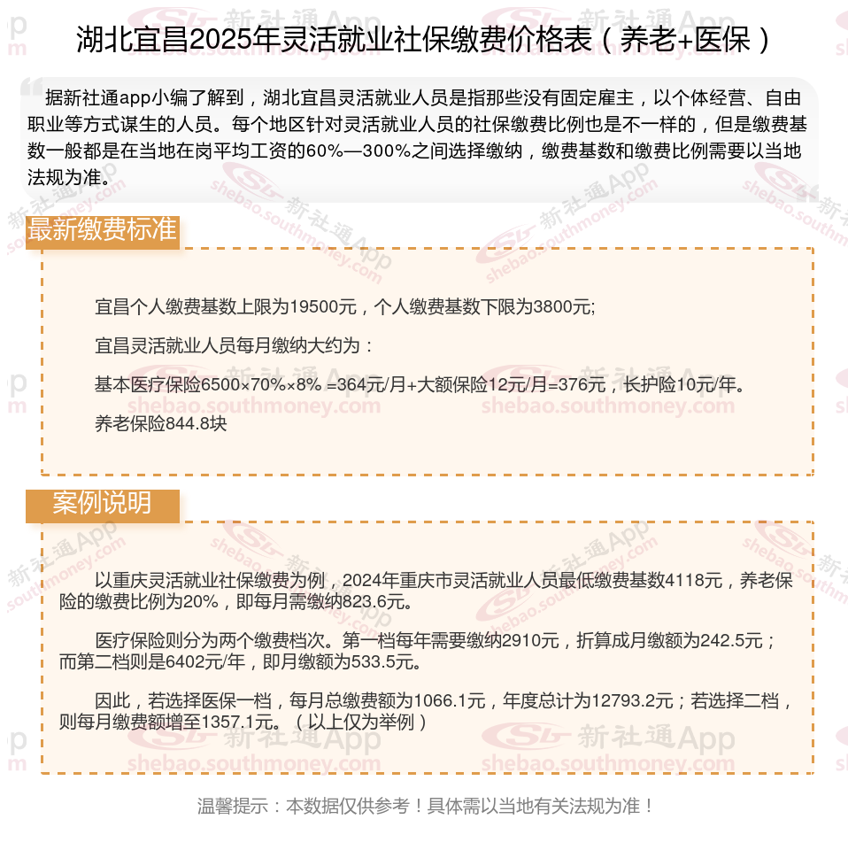 湖北宜昌灵活就业社保交多少钱?最新湖北宜昌灵活就业人员社保养老缴费标准明细来了,根据新社通app-社保缴费查询工具提供的2025社保缴费标准详情数据: