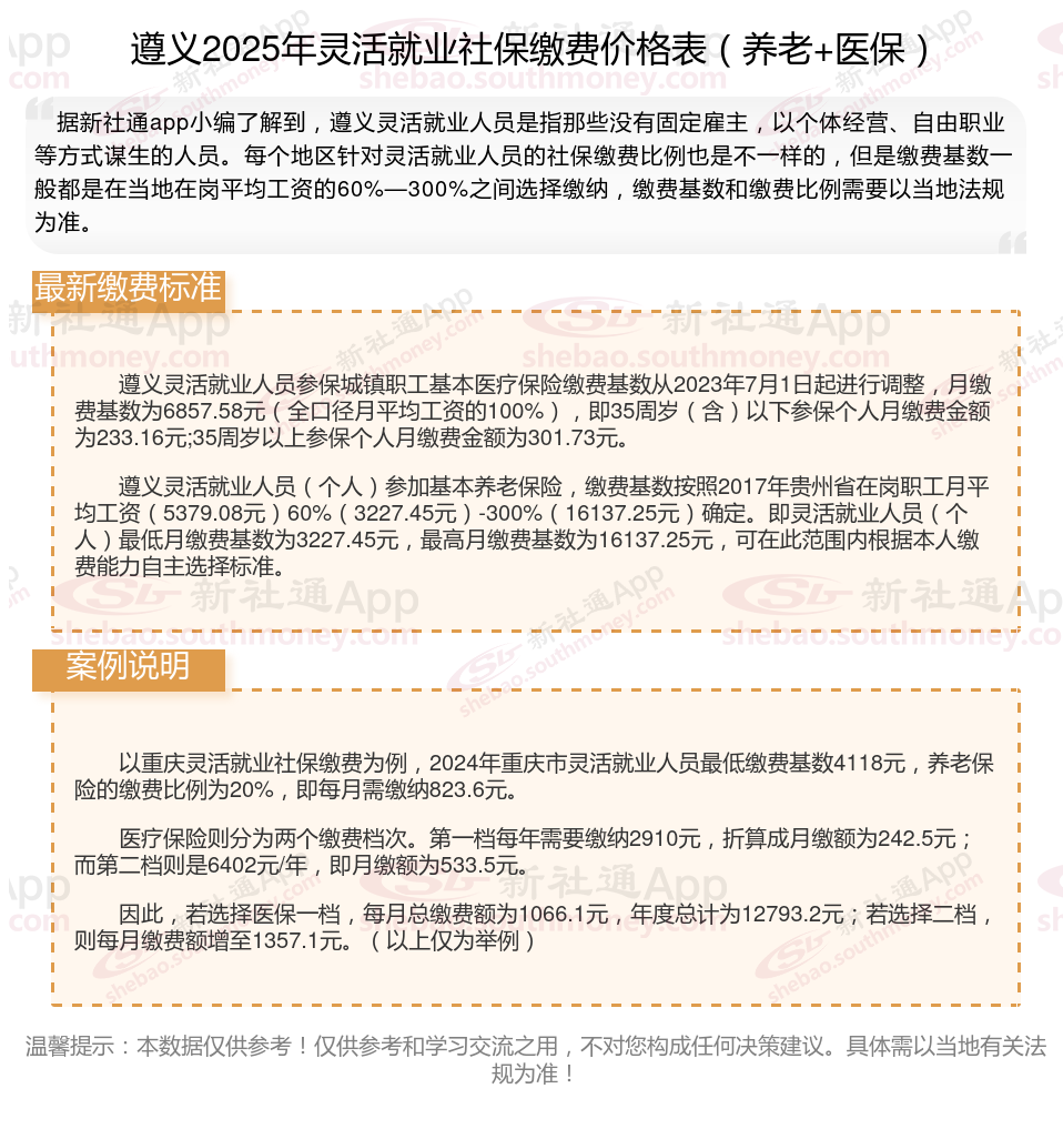 据新社通app数据显示,遵义灵活就业人员养老保险缴费基数2024-2025年最新标准如下: