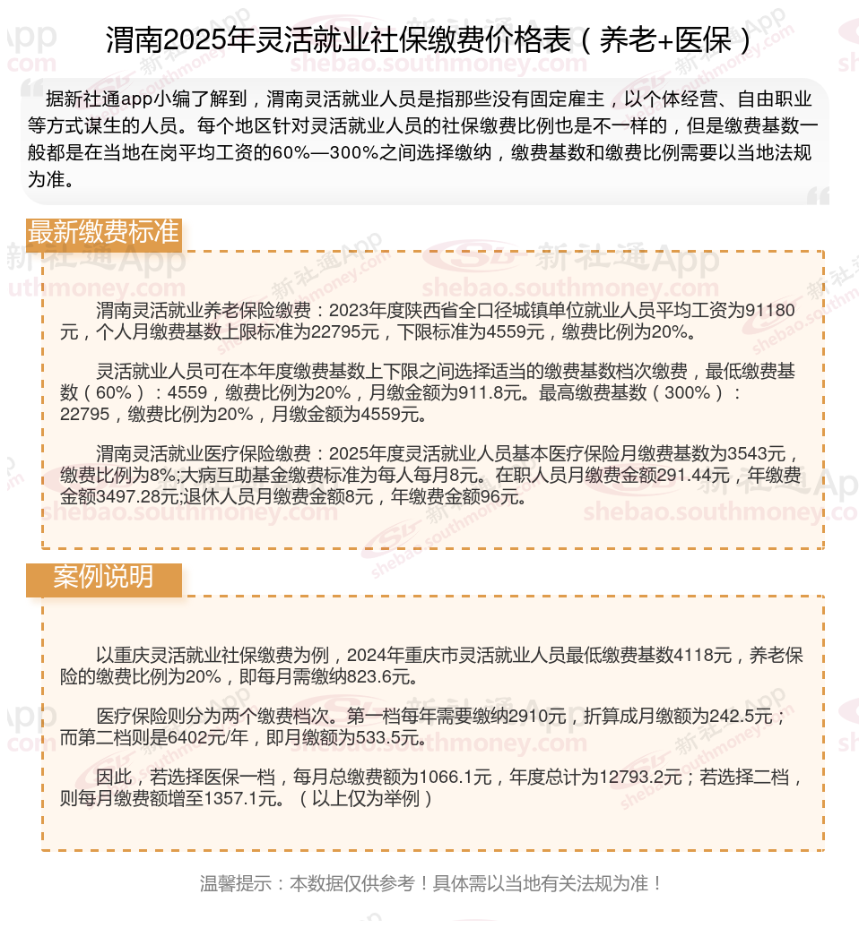 灵活就业社保缴费价格表来了!2024-2025年渭南灵活就业人员社保需要缴费多少钱一个月?根据新社通app-社保缴费查询工具提供的最新数据如下: