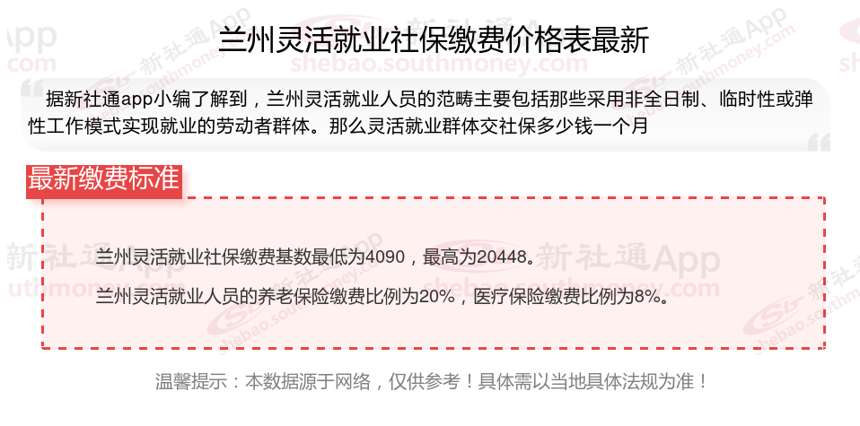 据新社通app数据显示,2024-2025年兰州灵活就业人员养老保险的缴费标准是根据缴费基数来确定的: