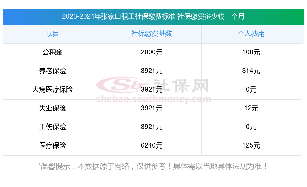2025年张家口社保缴费多少钱?下表是2024-2025年张家口社保费用明细参考,新社通app-社保缴费查询工具提供的最新数据如下: