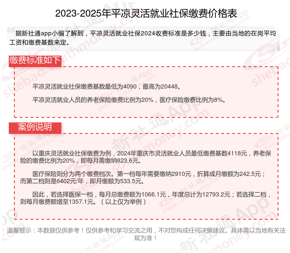 平凉灵活就业社保缴费标准,平凉灵活就业社保缴费标准是多少钱一个月?下表是2024-2025年平凉社保费用明细参考,根据新社通app-社保缴费查询工具提供的最新数据如下: