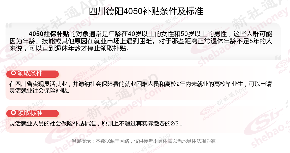 4050社保补贴标准据新社通app小编了解,通常,4050社保补贴包含基本医疗保险和基本养老保险两个险种,社保补贴金额为申请人实际缴纳基本养老保险和基本医疗保险金额的2/3,具体标准以当地社保局公布的数据为准!那么四川德阳灵活就业人员4050补贴最新标准是多少,四川德阳4050灵活就业人员社保补贴一年可以有多少钱?接下来随新社通APP小编具体了解一下4050社保补贴内容。
