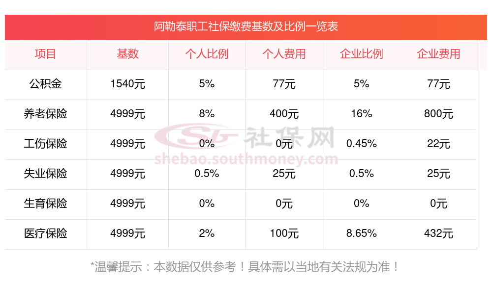 社保(社会保险)是公民基本生活和社会福利而建立的一种强制性社保制,旨在通过社会共济的方式,分担个人在养老、医疗、失业、工伤、生育等方面的风险。接下来随社保君了解一下2025年阿勒泰社保交多少钱,2025年阿勒泰社保缴费标准的详细内容。