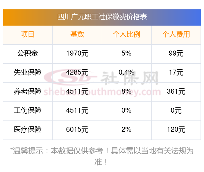 再来了解一下,单位每个月扣的五险一金是多少四川广元五险一金交多少钱一个月?和社保网-APP一起来看看2024-2025年四川广元最低社保费用明细参考,新社通app-社保缴费查询工具提供的最新数据如下: