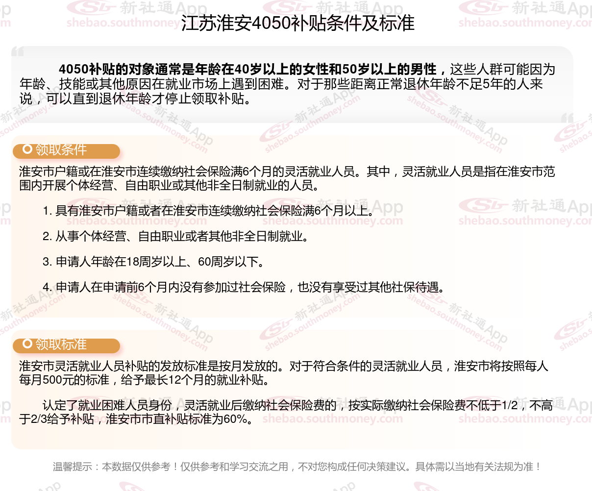 一、2025年江苏淮安灵活就业4050社保补贴标准是多少?申请条件是什么?