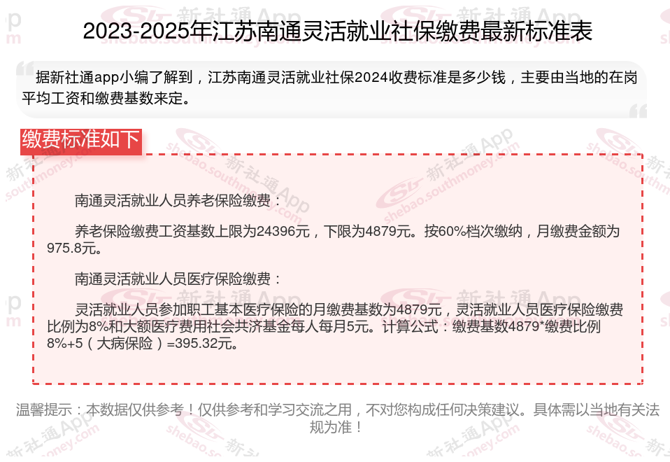 那么,灵活就业者社保是多少钱一个月 江苏南通灵活社保交多少钱?根据新社通app-社保缴费查询工具提供的2025社保缴费标准详情数据:
