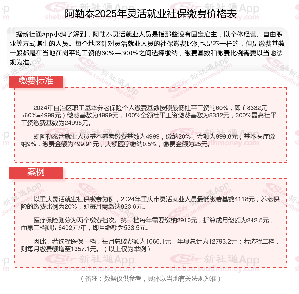 那么,打工人社保是多少钱一个月 阿勒泰灵活社保交多少钱?根据新社通app-社保缴费查询工具提供的2025社保缴费标准详情数据: