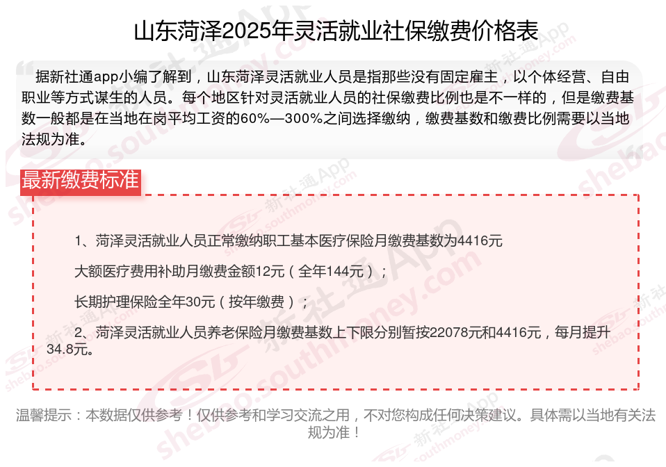 那么,山东菏泽灵活就业人员社保缴费基数最新标准,山东菏泽灵活就业社保多少钱一个月?根据新社通app-社保缴费查询工具提供的2025社保缴费标准详情数据: