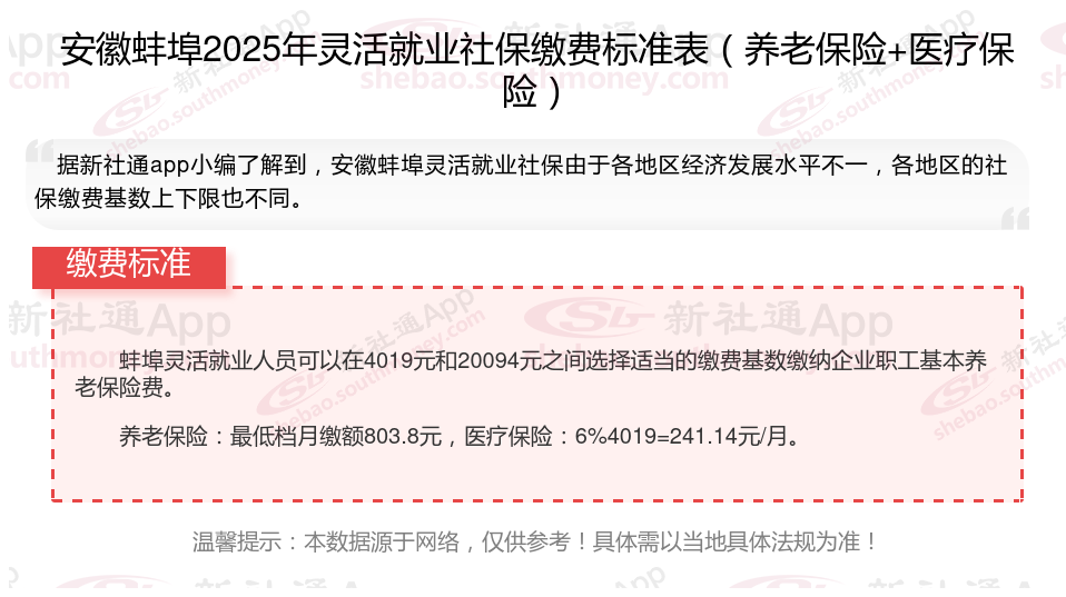 安徽蚌埠灵活就业社保缴费标准来了 灵活就业社保最低要交多少钱?根据新社通app-社保缴费查询工具提供的最新数据如下: