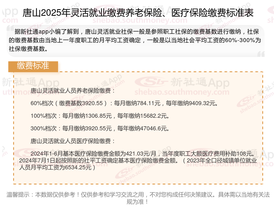 据新社通app数据显示,唐山灵活就业养老保险缴费基数2024-2025年最新标准如下: