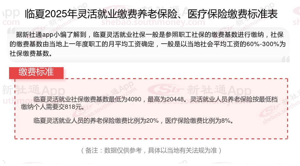 临夏灵活就业社保交多少钱?最新临夏灵活就业人员社保养老缴费标准明细来了,根据新社通app-社保缴费查询工具提供的2025社保缴费标准详情数据: