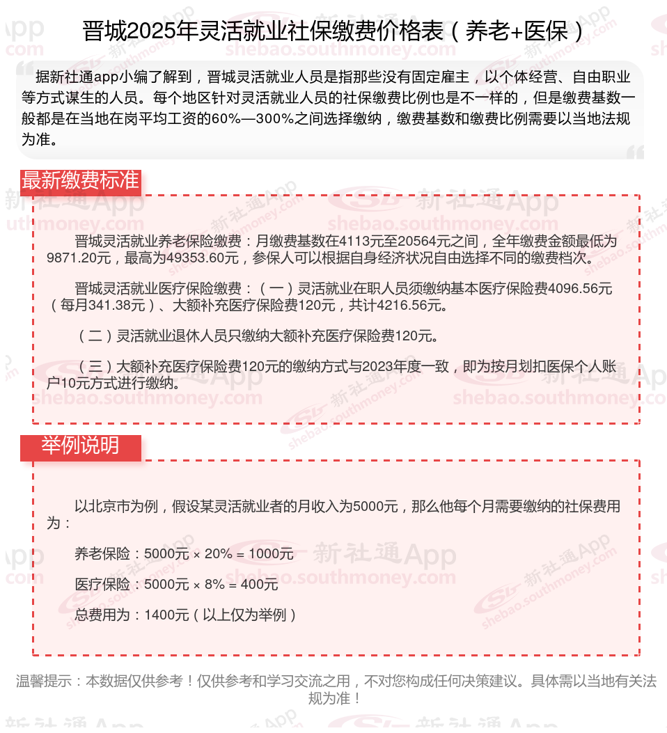 据新社通app数据显示,2024-2025年晋城灵活就业人员养老保险的缴费标准: