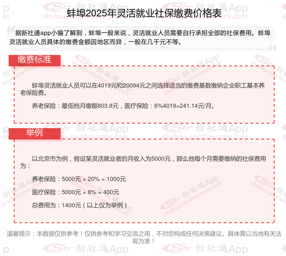 蚌埠灵活就业自己交社保一个月要交多少钱?蚌埠灵活就业人员社会保险缴费标准,根据新社通app-社保缴费查询工具提供的最新数据如下: