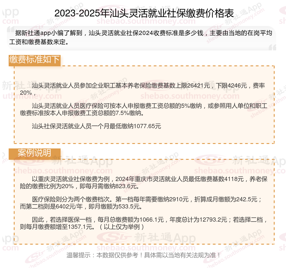 据新社通app数据显示,汕头灵活就业人员养老缴费基数2024-2025年最新标准如下: