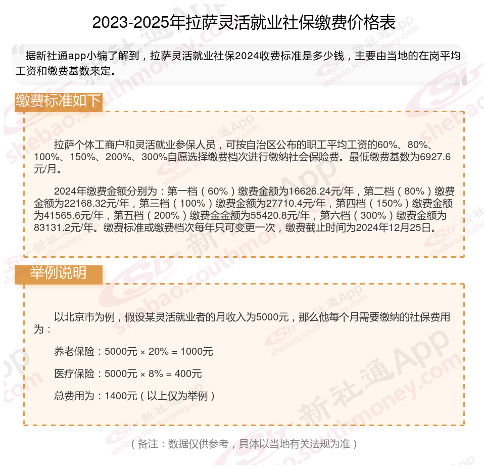 据新社通app数据显示,2024-2025年拉萨灵活就业人员养老保险的缴费标准是根据缴费基数来确定的: