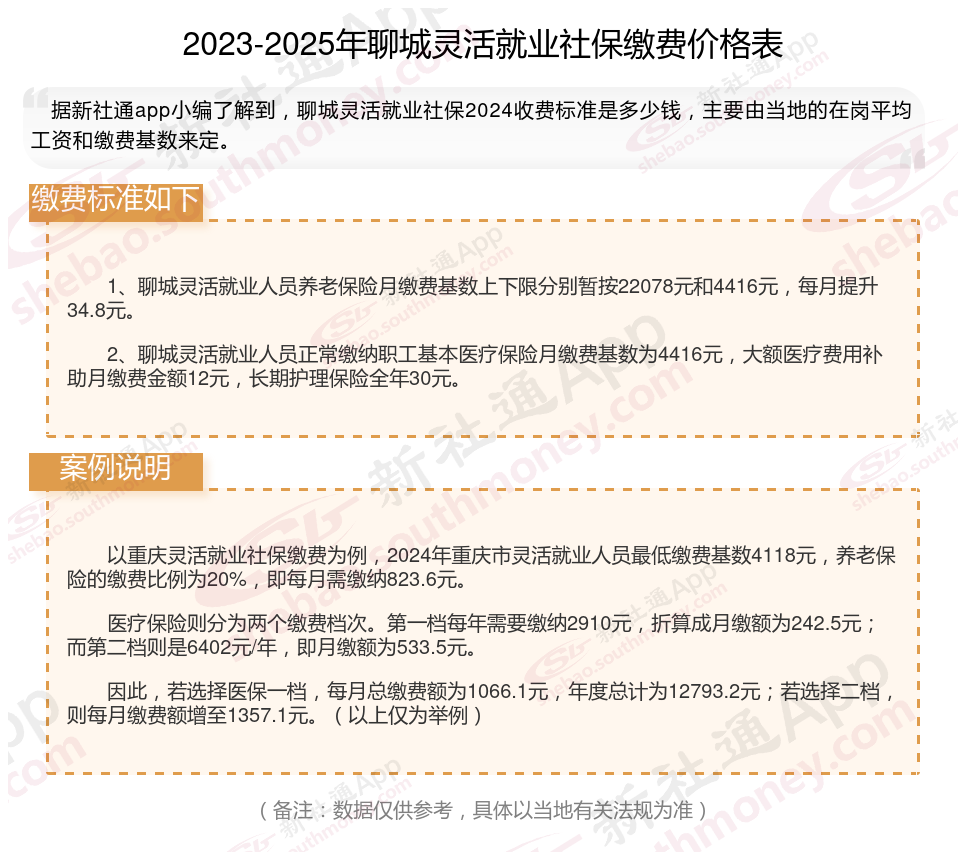 据新社通app数据显示,聊城灵活就业养老保险缴费基数2024-2025年最新标准如下: