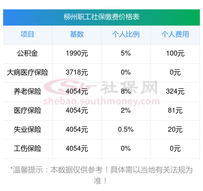 柳州缴费社保比例一览 社保公司和个人各交多少?下表是2024-2025年柳州社保费用明细参考,新社通app-社保缴费查询工具提供的最新数据如下:
