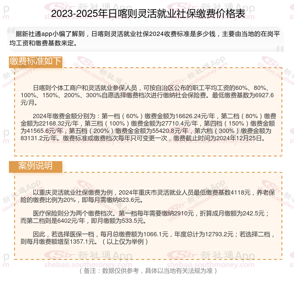 据新社通app数据显示,日喀则灵活就业养老保险缴费基数2024-2025年最新标准如下:
