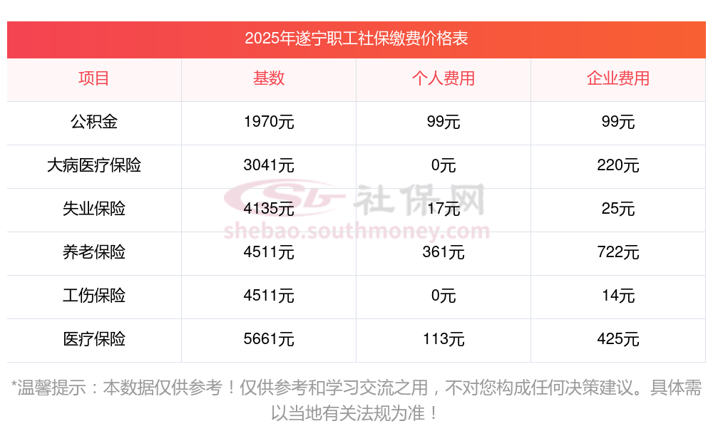 遂宁缴费社保比例一览 社保公司和个人各交多少?下表是2024-2025年遂宁社保费用明细参考,新社通app-社保缴费查询工具提供的最新数据如下: