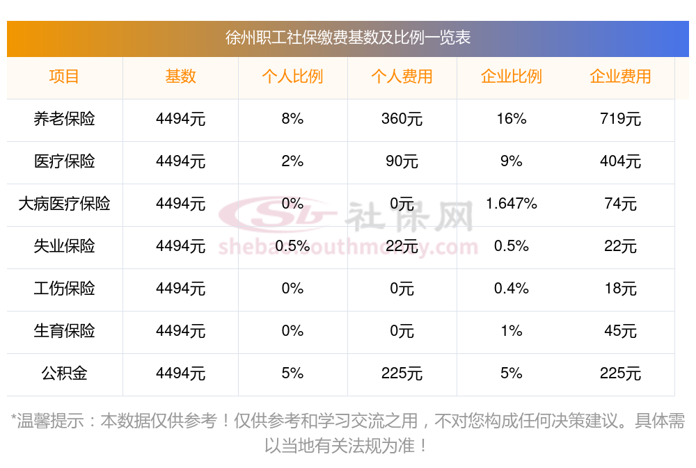 据新社通小编了解到,徐州职工社保缴费基数为:4494.00,个人费用约为:359.52元,企业费用约为:719.04元。