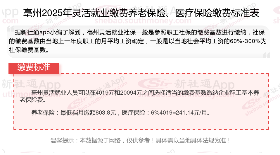 亳州灵活就业社保交多少钱一个月?2025社保缴费标准详情,根据新社通app-社保缴费查询工具提供的2025社保缴费标准详情数据如下: