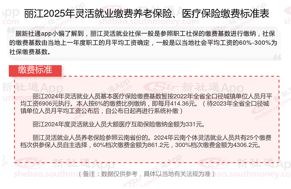 那么,丽江灵活就业人员社保缴费基数最新标准,丽江灵活就业社保多少钱一个月?根据新社通app-社保缴费查询工具提供的2025社保缴费标准详情数据: