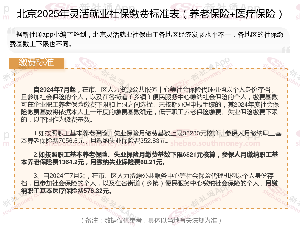 据新社通app数据显示,北京灵活就业人员养老缴费基数2024-2025年最新标准如下: