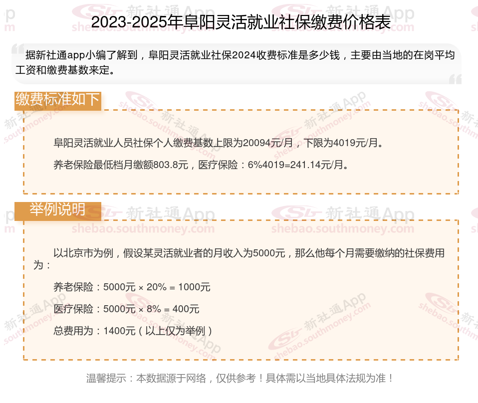 灵活就业社保缴费价格表来了!2024-2025年阜阳灵活就业人员社保需要缴费多少钱一个月?根据新社通app-社保缴费查询工具提供的最新数据如下: