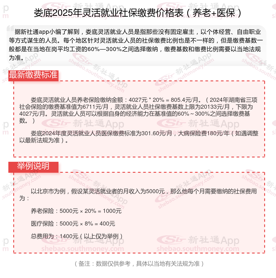 那么,娄底灵活就业人员社保多少钱一个月?根据新社通app-社保缴费查询工具提供的2025社保缴费标准详情数据: