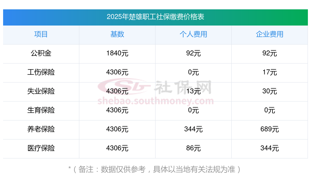 楚雄社保每月缴费时间是几号 个人五险一金最低标准多少钱一个月?下面和社保丫丫一起来看看2024-2025年楚雄最低标准社保费用明细参考,新社通app-社保缴费查询工具提供的最新数据如下: