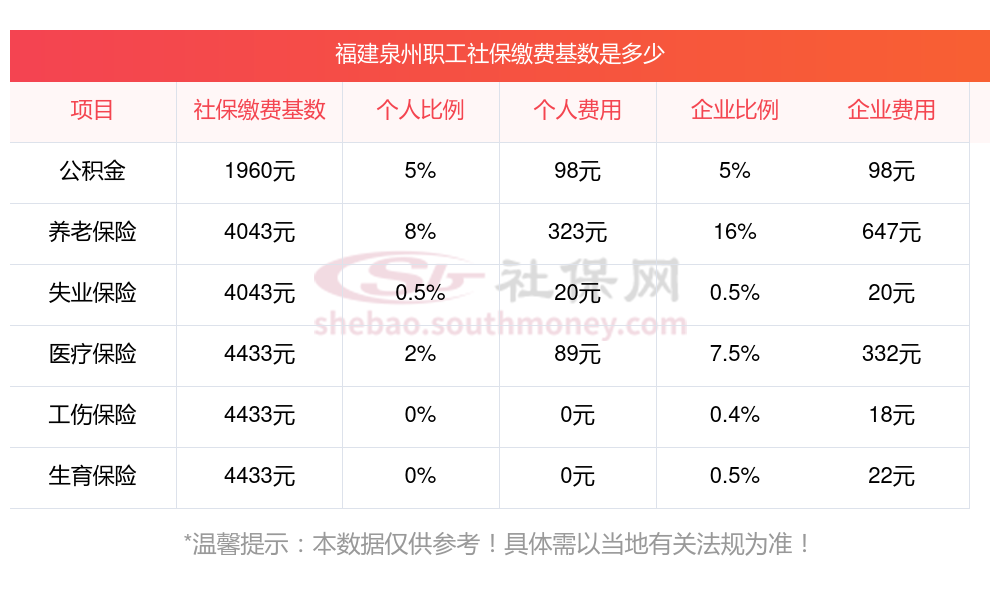 福建泉州社保缴费比例和基数2025年来了福建泉州社保缴费最新调整一览表,新社通app-社保缴费查询工具提供的最新数据如下: