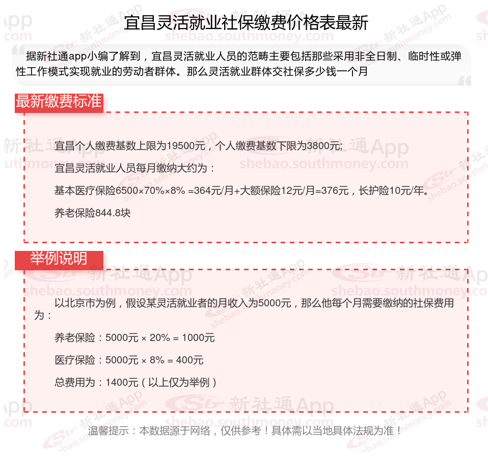 宜昌灵活就业社保2025年收费标准是多少钱,主要由当地的在岗平均工资和缴费基数来定。其次,灵活就业社保缴纳跟职工缴纳不同的地方在于,灵活就业社保参保只能参保养老保险和医疗保险,且缴纳比例完全由个人承担。另外,灵活就业人员社保参保选择,可自由选择参保城镇职工社保和城乡居民保险。2025年宜昌灵活就业社保缴多少钱?如何缴纳?怎么计算待遇?新社通APP小编将在下文为您详细说明。