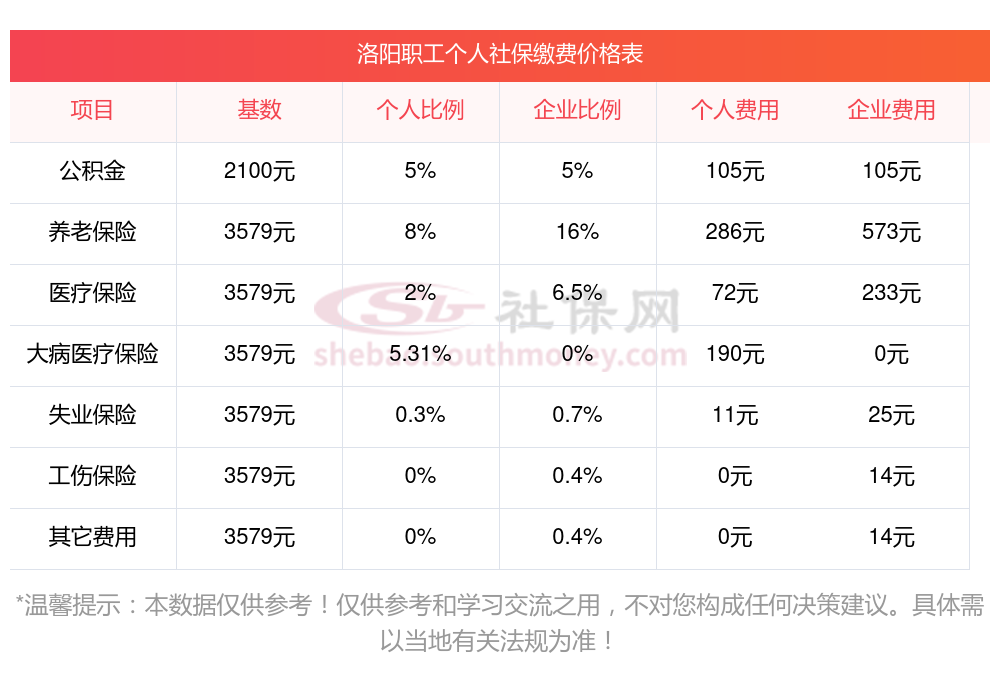 洛阳职工社保缴费多少钱?2025年洛阳职工社保缴费基数最新参考为:3579.00,具体如下: