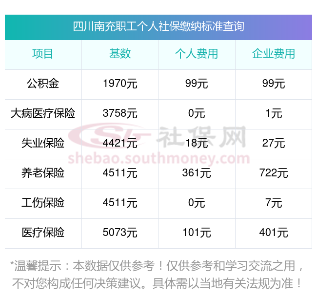 2025年四川南充社保缴费多少钱?下表是2024-2025年四川南充社保费用明细参考,新社通app-社保缴费查询工具提供的最新数据如下: