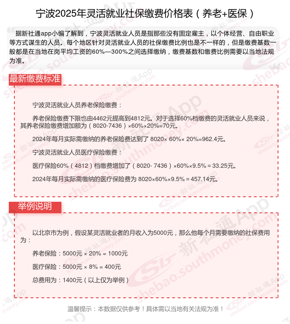 那么,宁波灵活就业人员社保缴费基数最新标准,宁波灵活就业社保多少钱一个月?根据新社通app-社保缴费查询工具提供的2025社保缴费标准详情数据: