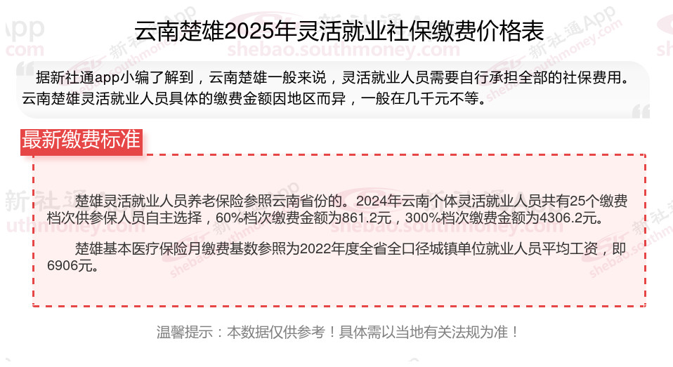 那么,云南楚雄灵活就业人员社保缴费基数最新标准,云南楚雄灵活就业社保多少钱一个月?根据新社通app-社保缴费查询工具提供的2025社保缴费标准详情数据: