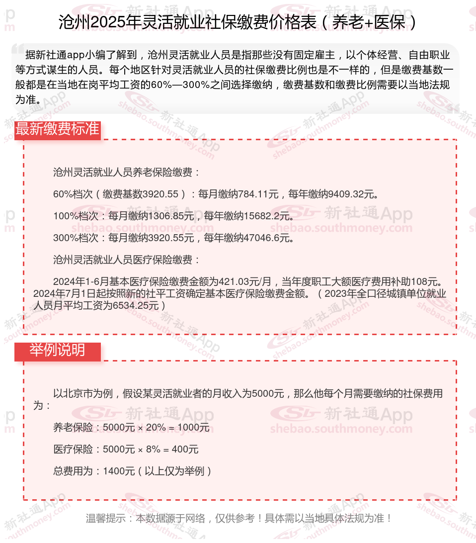 据新社通app数据显示,沧州灵活就业人员养老保险缴费基数2024-2025年最新标准如下: